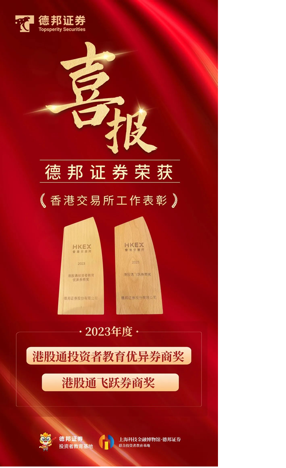 3月20日,由香港交易所举办的“香港交易所大奖暨2023内地市场机构庆典”在上海隆重举行。德邦证券荣获2023年度“港股通飞跃券商奖”、“港股通投资者教育优异券商奖”两项荣誉,体现了港交所对德邦证券港股通工作的认可与鼓励。